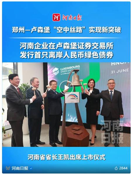 當(dāng)?shù)貢r間6月21日上午,中豫航空集團(tuán)以河南航投為主體發(fā)行的3年期人民幣境外債券上市儀式在盧森堡證券交易所舉行。這是中國企業(yè)在歐洲發(fā)行的首只支持可持續(xù)航空燃料(SAF)的綠色債券,也是河南企業(yè)發(fā)行的首只離岸人民幣綠色債券,鄭盧“空中絲路”資金融通實(shí)現(xiàn)新突破。