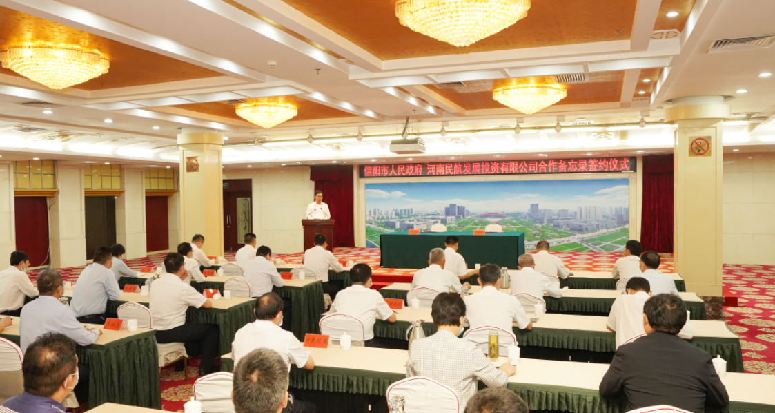 9月10日,河南民航發(fā)展投資有限公司與信陽市人民政府在信陽市行政中心簽約,以項(xiàng)目為抓手,就發(fā)展航空產(chǎn)業(yè)、推動信陽革命老區(qū)振興展開全面合作。信陽市委書記王東偉,市委副書記、市長蔡松濤,河南航投黨委書記、董事長張明超,總經(jīng)理、黨委副書記、副董事長劉建葆,以及信陽市委常委、市委秘書長楊進(jìn),副市長呂旅,市政府秘書長張全勝,河南航投副總經(jīng)理謝亞偉、喬長恩參加儀式。雙方在簽約前進(jìn)行了座談,張明超與蔡松濤在儀式上分別致辭。