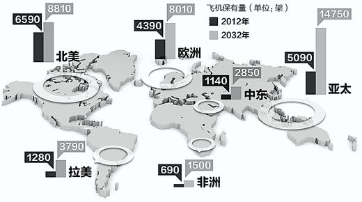 根據(jù)波音公司的預(yù)測,未來20年全球民機(jī)市場規(guī)模將翻一番,新興市場成為增長主動力。到2032年,全球?qū)⑿略龀^3.5萬架飛機(jī),總額高達(dá)4.8萬億美元。亞太市場增幅最大,將新增1.282萬架飛機(jī),總額1.89萬億美元。其中,中國市場發(fā)展最為迅速??湛凸究偛眉媸紫瘓?zhí)行官密法布里斯·布利葉認(rèn)為,中國航空業(yè)的迅速發(fā)展是中國經(jīng)濟(jì)社會發(fā)展的必然產(chǎn)物,中國航空業(yè)發(fā)展的年均增速約為10%,同期全球航空業(yè)的增速則為5%。在未來20年,中國將成為世界最大的航空市場。