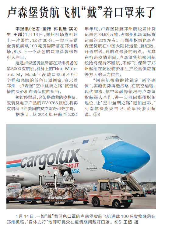 這是盧森堡貨航降落在鄭州機(jī)場的第5000次航班,機(jī)身上的“NotWith-outMyMask”(沒戴口罩可不行)字樣和亮眼的藍(lán)色口罩圖案,宣示著鄭州—盧森堡“空中絲綢之路”抗擊疫情的決心和連通保供的擔(dān)當(dāng)。
