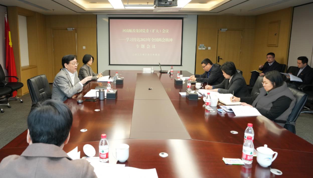 3月24日,河南航投集團召開黨委(擴大)會議,集中學習習近平總書記重要講話和全國兩會精神,安排部署貫徹落實工作。集團黨委書記、董事長張明超主持會議,領導班子其他成員和部分中層管理人員參會。