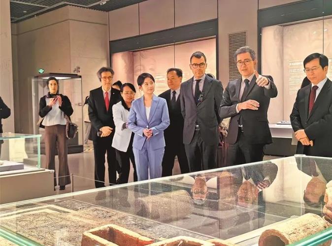 盧森堡駐華大使盧睿朗(右三)一行走進(jìn)“小而美——盧森堡文物精品展”現(xiàn)場(chǎng)。