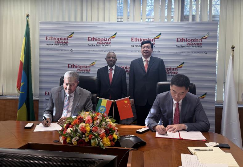 當(dāng)天下午,中豫航空集團(tuán)與埃塞俄比亞航空集團(tuán)在亞的斯亞貝巴簽署合作備忘錄,就深化航空貨運(yùn)業(yè)務(wù)合作、推動(dòng)航空領(lǐng)域全方位合作達(dá)成一致意見(jiàn)。張明超和埃塞俄比亞航空集團(tuán)首席執(zhí)行官M(fèi)esfin Tasew共同見(jiàn)簽。根據(jù)約定,雙方將發(fā)揮各自的區(qū)位、航線、貨源等資源優(yōu)勢(shì),共同推進(jìn)增開(kāi)中非貨運(yùn)航線,開(kāi)展貨運(yùn)中轉(zhuǎn)等業(yè)務(wù),探索在海外貨站、機(jī)務(wù)維修、航空培訓(xùn)、仿真模擬設(shè)備研發(fā)制造、航空金融服務(wù)、航空基礎(chǔ)設(shè)施建設(shè)等方面開(kāi)展合作。簽約前,中豫航空集團(tuán)代表團(tuán)與Mesfin Tasew圍繞鄭州—亞的斯亞貝巴“雙樞紐”建設(shè)溝通會(huì)談。張明超表示,埃塞俄比亞位于非洲、中東和亞洲的十字路口,地理位置優(yōu)越;埃塞俄比亞航空公司客貨運(yùn)服務(wù)全球覆蓋廣泛,是非洲領(lǐng)先的航司之一,雙方優(yōu)勢(shì)互補(bǔ)、合作前景廣闊。中豫航空集團(tuán)將扎實(shí)推進(jìn)與埃塞俄比亞航空集團(tuán)的全鏈條業(yè)務(wù)合作,復(fù)制鄭盧“雙樞紐”建設(shè)經(jīng)驗(yàn),為兩地經(jīng)貿(mào)往來(lái)開(kāi)辟新通道。Mesfin Tasew介紹了埃塞俄比亞航空集團(tuán)的基本情況。他說(shuō),埃塞俄比亞航空集團(tuán)愿攜手中豫航空集團(tuán),共同致力“雙樞紐”建設(shè),通過(guò)空中走廊把更多的中國(guó)商品輸入非洲,也將更多的非洲產(chǎn)品運(yùn)送到中國(guó)和世界各地。簽約后,代表團(tuán)一行實(shí)地調(diào)研了埃塞俄比亞航空貨站和維修中心。