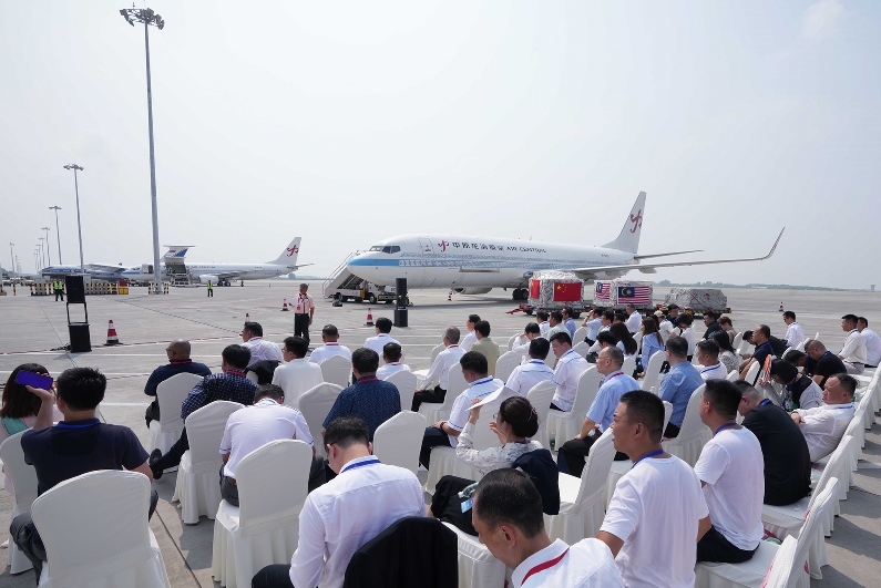 8月25日上午,吉隆坡-鄭州鮮食榴蓮首航接機儀式在鄭州機場舉行,馬來西亞首批鮮食榴蓮進入中國市場,中馬航空貨運樞紐項目加速推進。中豫航空集團黨委書記、董事長張明超,總經(jīng)理、黨委副書記、副董事長柳建民;馬來西亞駐華大使館工作人員,馬來西亞榴蓮廠商公會代表和榴蓮貿(mào)易供應鏈企業(yè)代表參加了儀式。